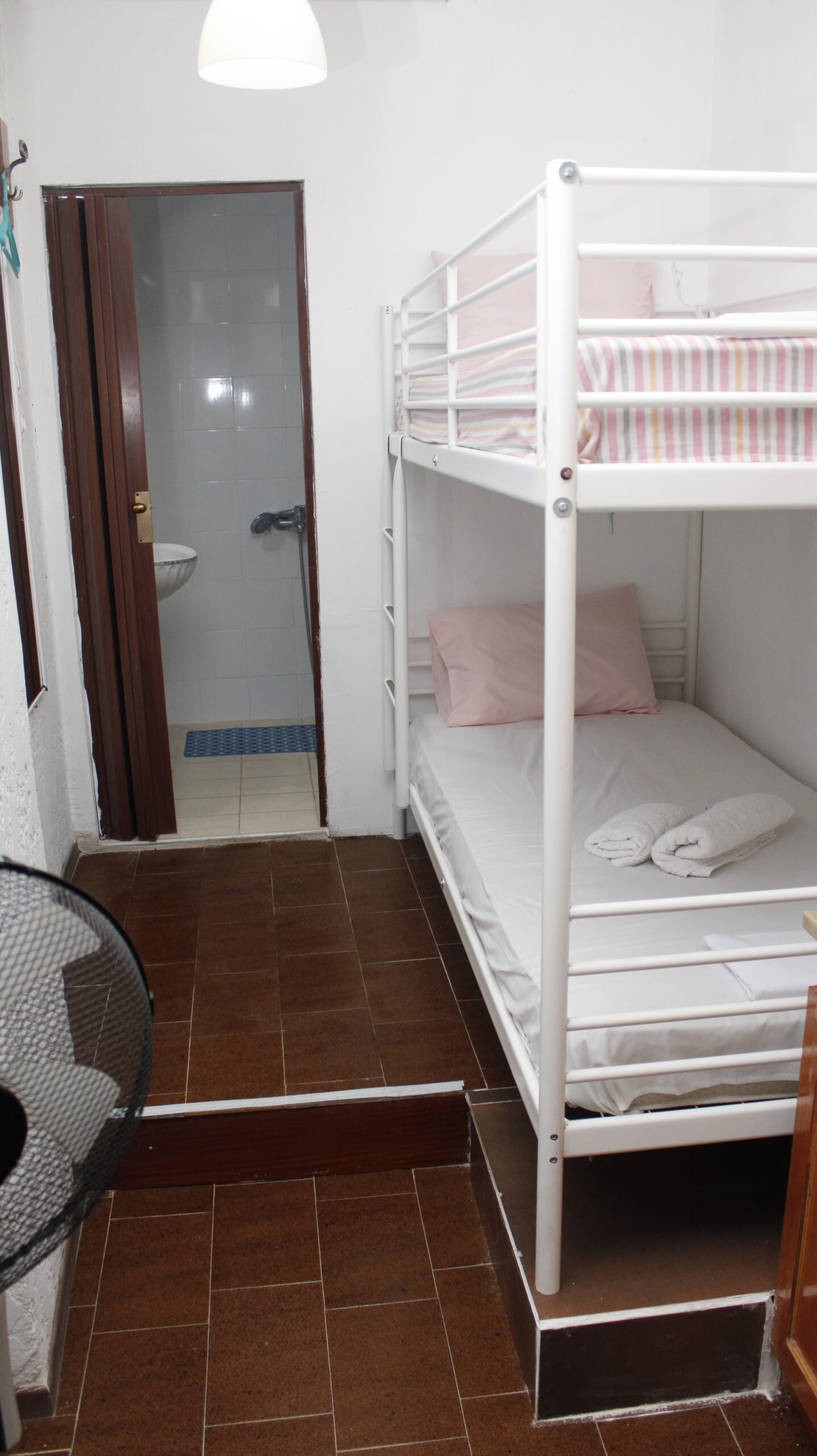 - Floor and ceiling fan, ironing board with iron and drying rack.